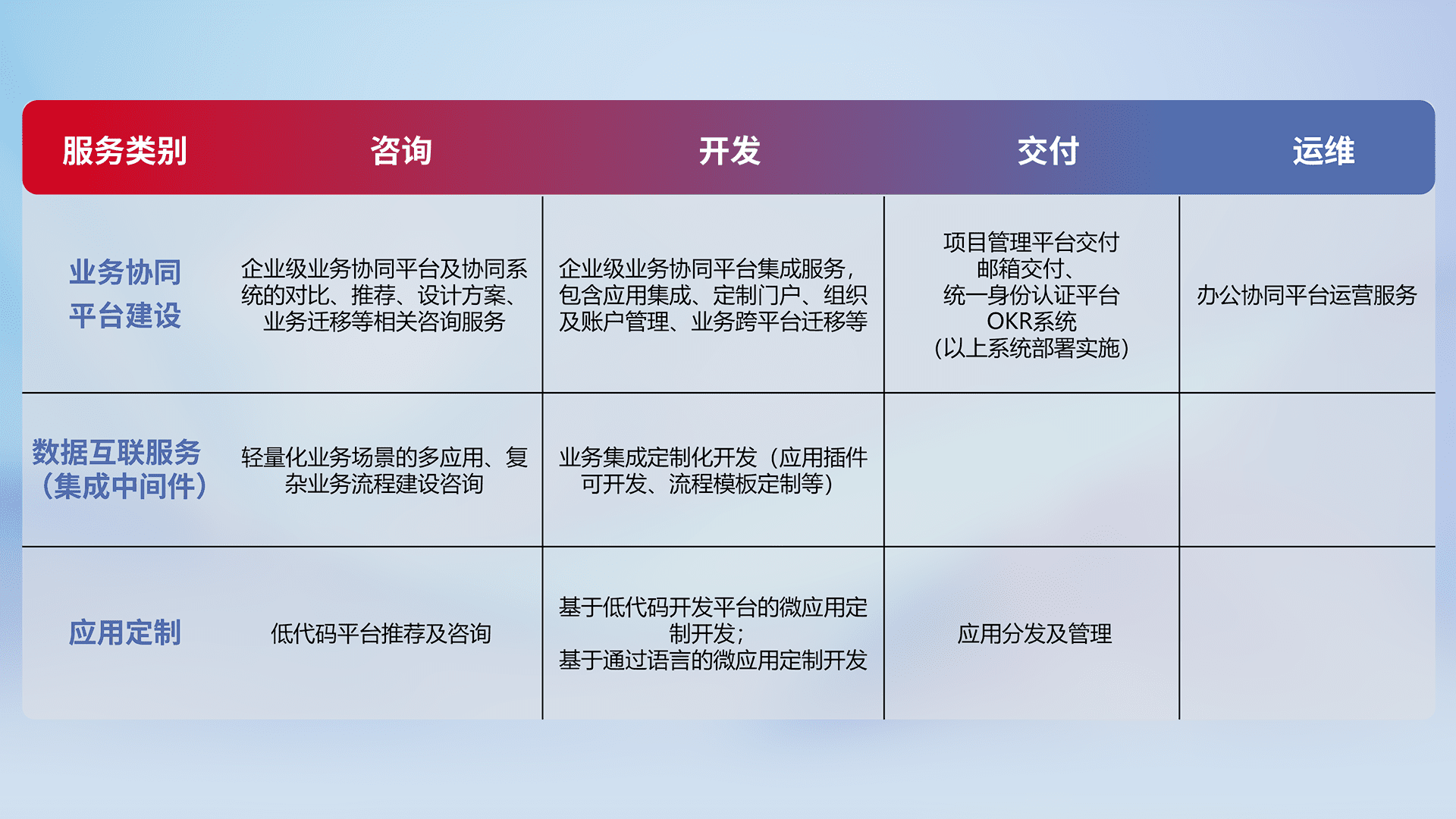 针对钉钉、、、、企微、、IDaas等平台级产品提供产品的规划、、、方案、、、、交付、、、定制化开发等服务,,实现如统一协同办公、、、、智能客户服务、、混合会议管理、、、智能数据查询、、、等业务场景,,,,实现数字化转型。。。。
